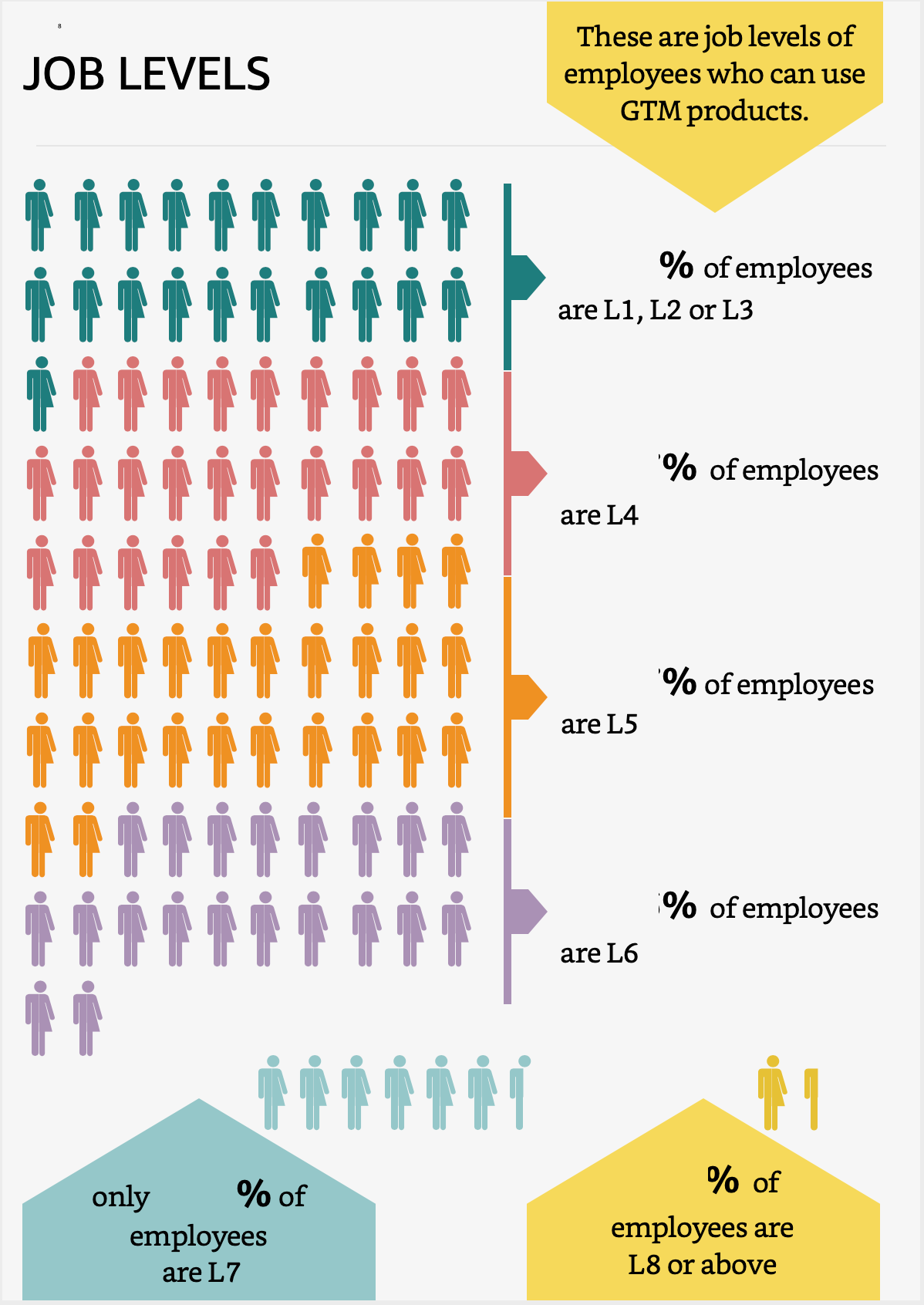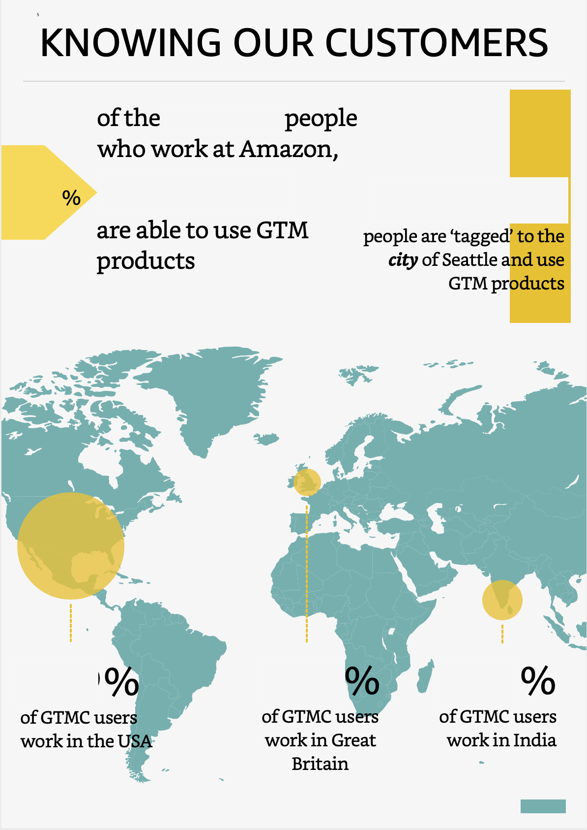 Like personas, using infographics to depict general information about who is using our products works as means to get new team members up to speed quickly, ground project teams in who is using our products, and helps the team think about where we might want to do additional research. For example, when I started on this team, we weren’t prioritizing localization at all, only offering content in English. After helping the team understand where our users were located and what language they preferred to access information in, I was responsible for running a localization program and our products were translated into 14 different languages.