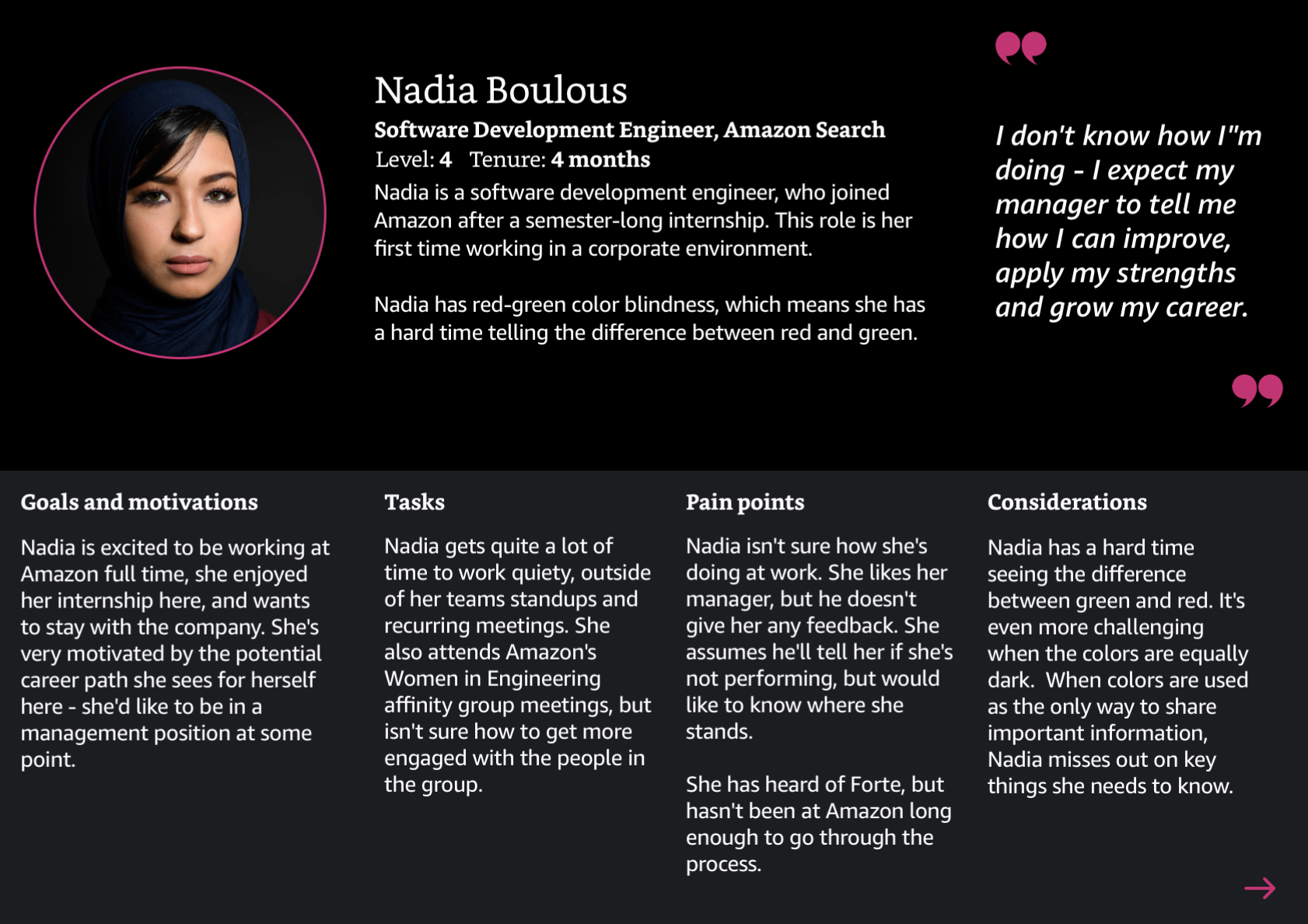 The design team infused the personas across our process - they became the examples that we used in design walkthroughs and presentations, they were the names and faces that we used to design products for, and we considered their needs when designing for accessibility.