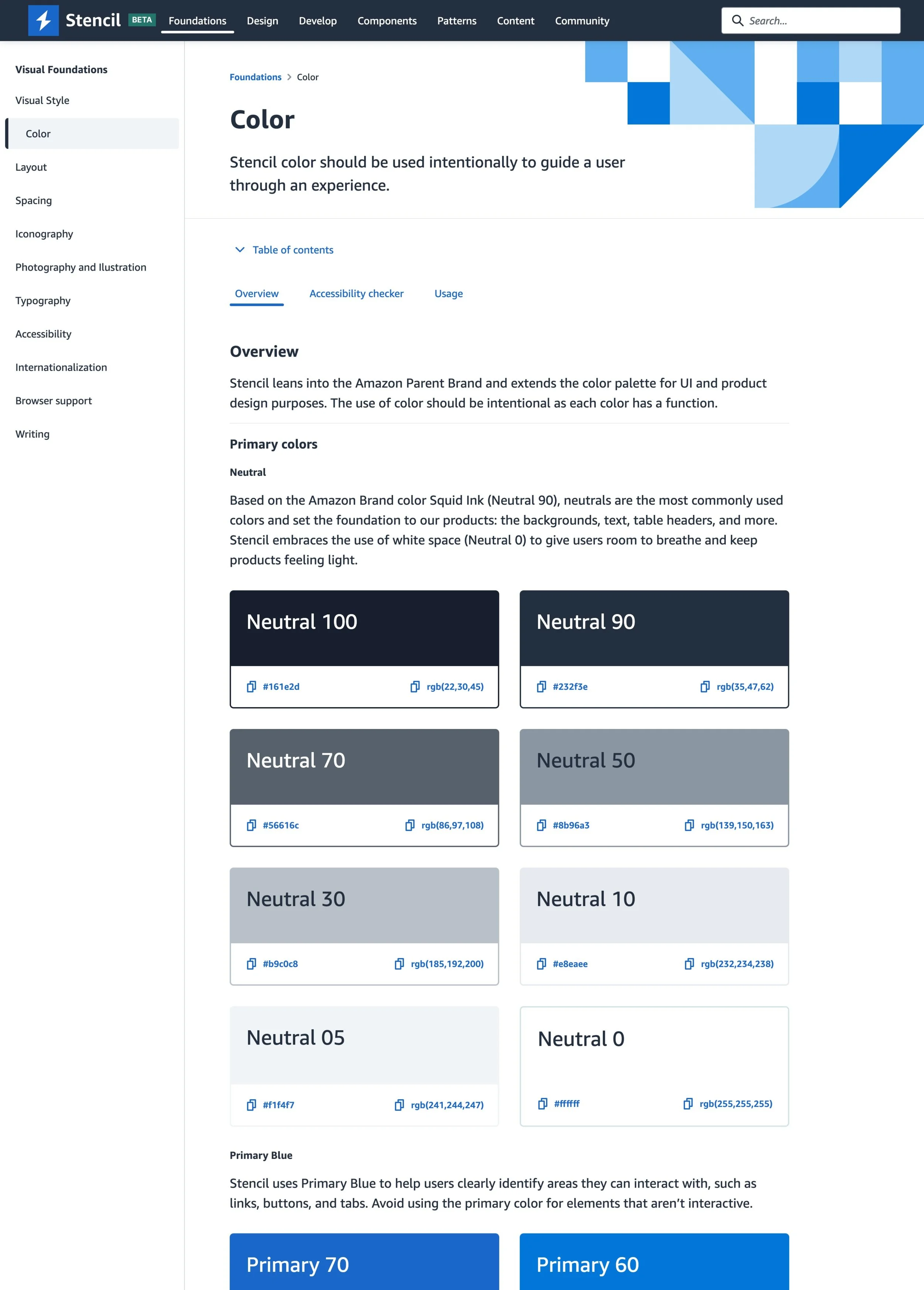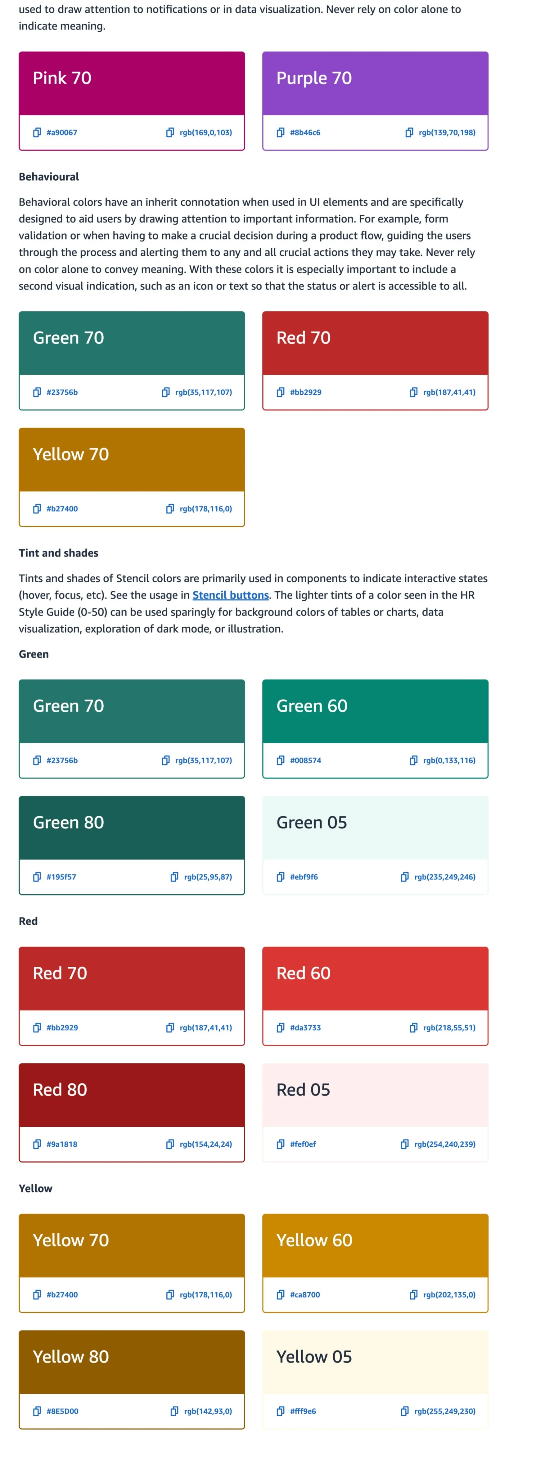 Defining the Stencil color palette was especially challenging. We landed on a blue theme based on multiple rounds of usability testing, consultation with Amazon’s brand team, and multiple stakeholder sessions. The biggest sticking point was how to use Amazon’s token orange color (many wanted to use it as the base for the system). We were able to convince stakeholders that smile orange should only be used as an accent in some contexts, due to accessibility and usability considerations.