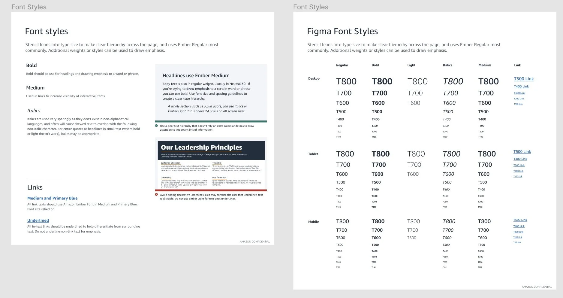 Stencil was the first project I pitched after taking the head of UX role for Amazon’s Global Talent Management Organization. As part of my first 90 days, I asked my team to audit both the experiences we were responsible for, as well as the experiences designed by adjacent teams that made up our larger customer journey. As my team synthesized the audit, creating a robust, accessible design system became a priority. My role became a strategic leader for the program, executive sponsor and advocate for funding the program, and creative director for the design system.